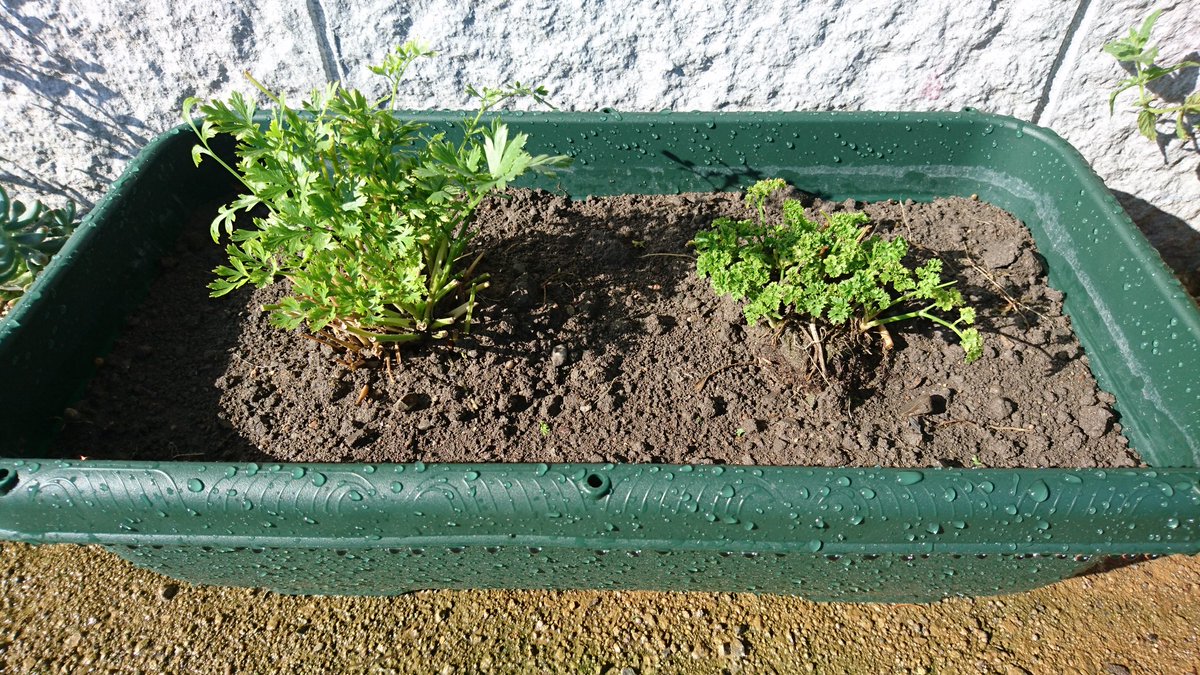 マニ 地植えにしてたパセリとイタリアンパセリ をプランターに移しました キアゲハの幼虫に齧られてかなり小さくなってます 雨の跳ね上がりで付いた土を洗うのが面倒臭かったりしていたので この子たちはプランターのほうが管理しやすいのかもしれませんね